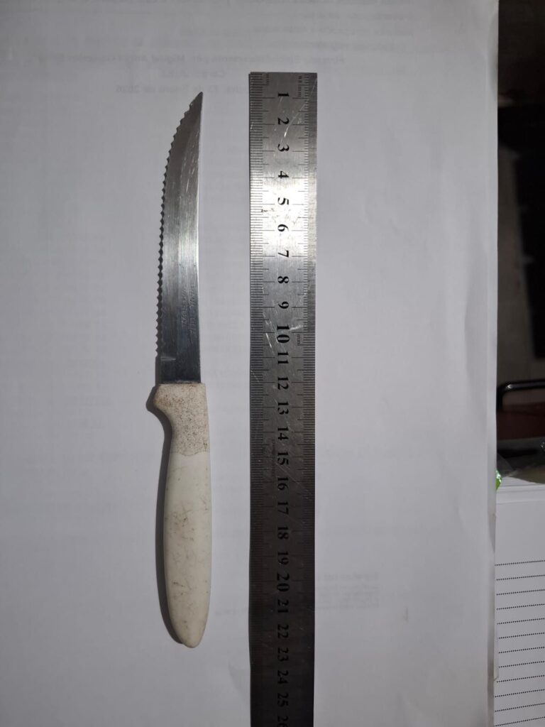 Según el informe policial, en ese momento el joven extrajo de su cintura un cuchillo marca Tramontina, de aproximadamente 21 centímetros de largo y mango blanco, con el cual amenazó a los intervinientes manifestando que no se entregaría, por lo que los agentes debieron utilizar la fuerza para reducirlo y despojarlo del arma blanca.