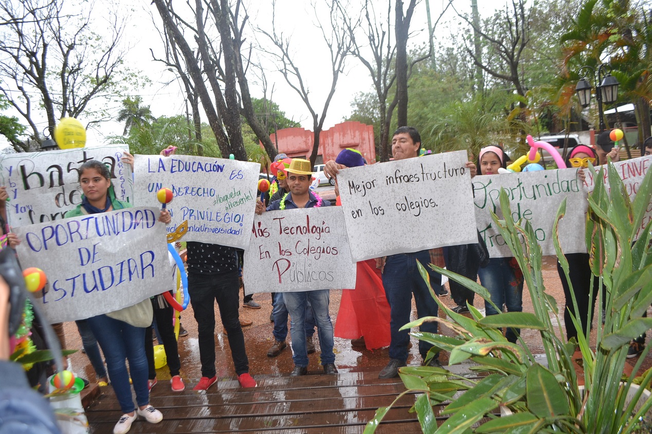 Unos 30 jóvenes de diferentes distritos –con disfraces varios, sonidos de pitos, sirenas y pancartas– marcharon desde la Casa de la Cultura hasta la Gobernación, donde leyeron un comunicado en el que explicaron que sufren el azote de la violencia estructural e institucional, que soportan los rigores de la criminalización de la protesta, y que padecen y resisten en la lucha por la tierra y el territorio, en disputa con los grandes latifundistas, militares, traficantes y multinacionales.