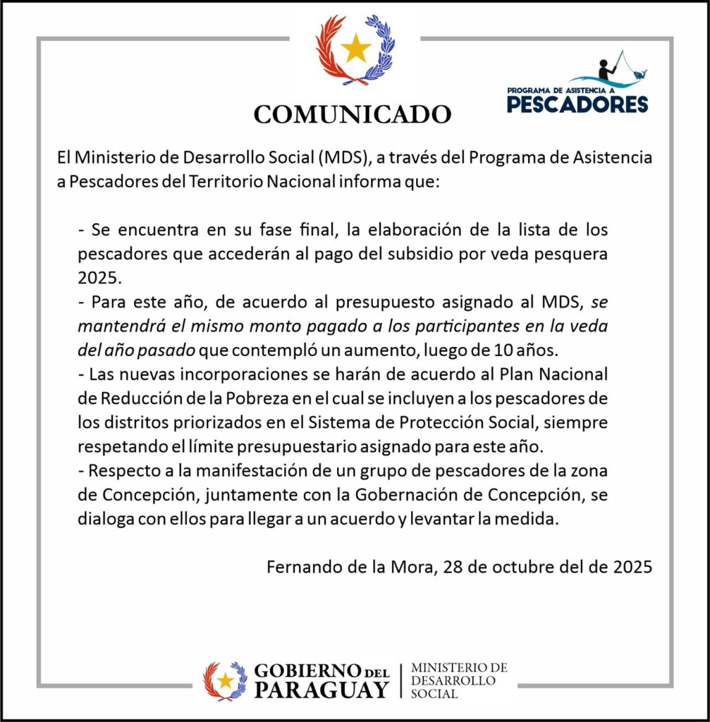 El Ministerio de Desarrollo Social (MDS), a través del Programa de Asistencia a Pescadores del Territorio Nacional emitió un comunicado indicando que se encuentra en su fase final, la elaboración de la lista de los pescadores que accederán al pago del subsidio por veda pesquera 2025.