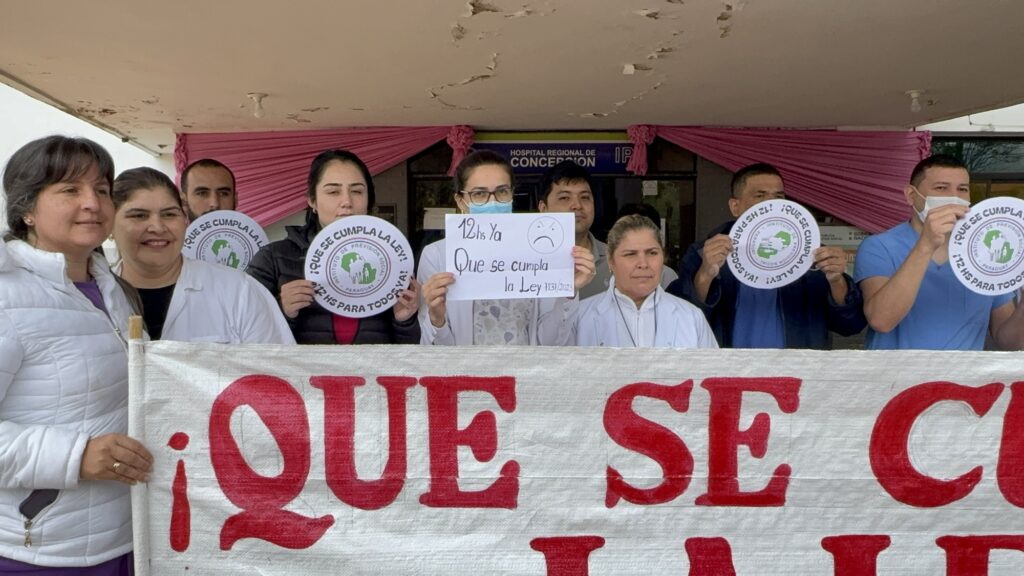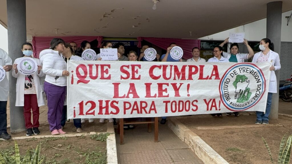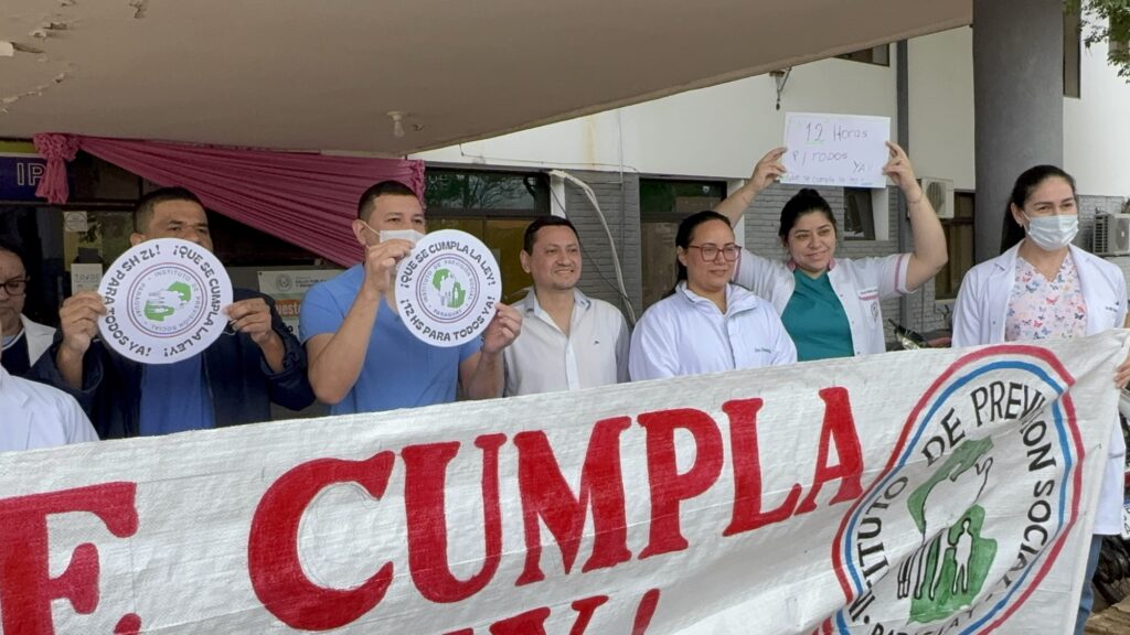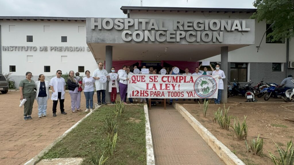 Profesionales de la salud se manifestaron frente al Hospital del Instituto de Previsión Social (IPS) de Concepción, reclamando la aplicación plena de la ley 7137/23 que establece la reducción de la carga horaria semanal para todos los médicos.