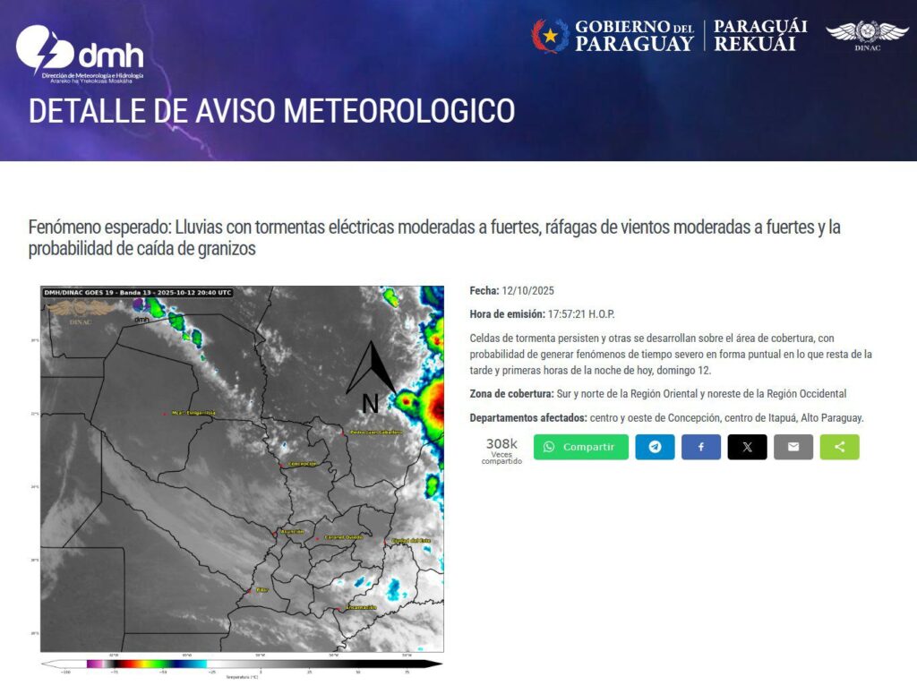 La Dirección de Meteorología e Hidrología (DMH) advierte sobre fenómenos de tiempo severo que podrían afectar esta tarde y noche a zonas de Concepción, Itapúa y Alto Paraguay.