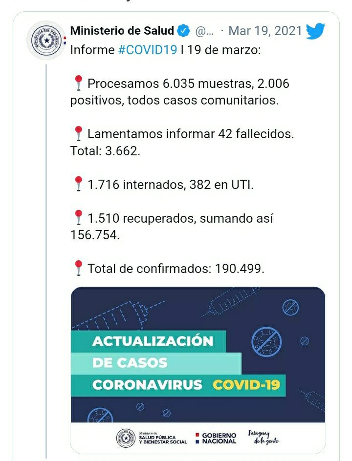 Procesamos 6.035 muestras, 2.006 positivos, todos casos comunitarios”, informó el Ministerio de Salud, este viernes.