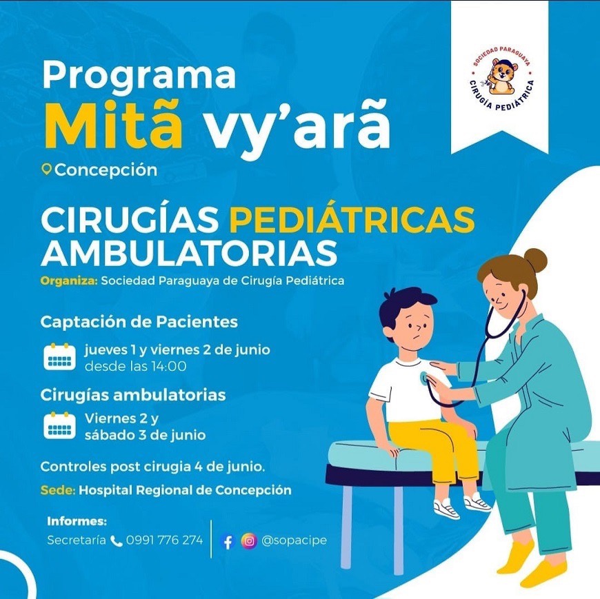 Unos 100 niños y niñas podrán acceder a cirugías ambulatorias gratuitas, mediante el Programa Mitã Vy´arã, de la Sociedad Paraguaya de Cirugía Pediátrica (SPCP), con el apoyo del Ministerio de Salud Pública y Bienestar Social, a través de la I Región Sanitaria – Concepción y su hospital regional.