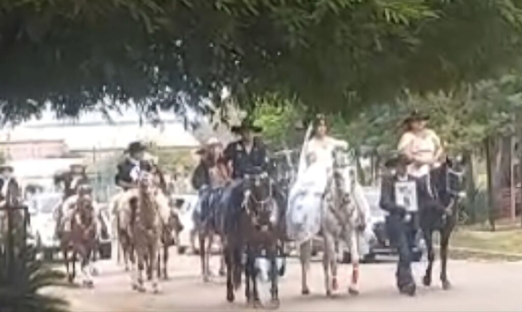 El hecho ocurrió en la mañana del sábado en la ciudad de Loreto, cuando la pareja llegó montada a caballo hasta el templo, acompañada por músicos que dieron un marco festivo y emotivo al momento. La escena, poco habitual en la actualidad, fue recibida con aplausos por parte de los presentes.