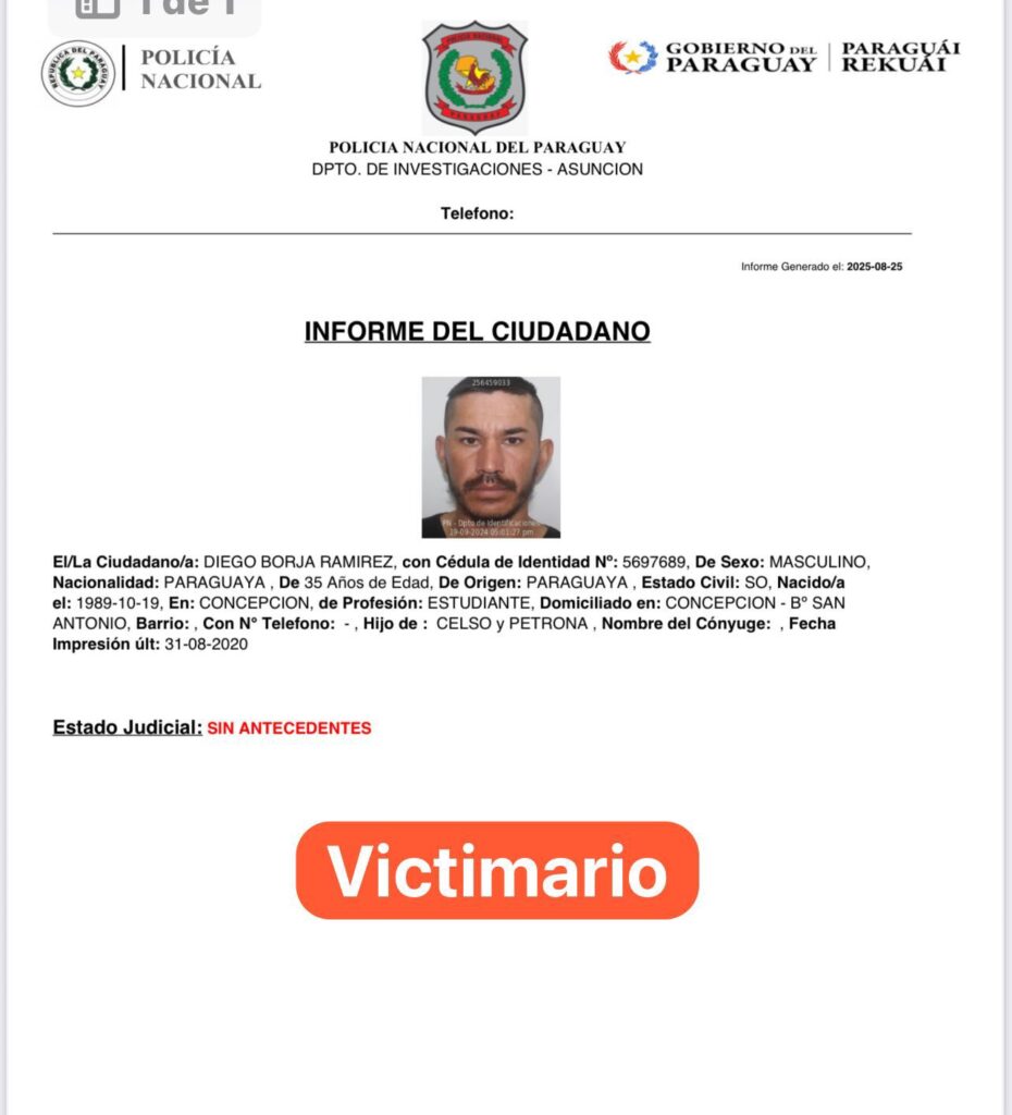 Minutos después, Borja protagonizó un accidente de tránsito al impactar contra un camión de gran porte sobre el puente Nanawa, donde finalmente fue aprehendido por agentes policiales.