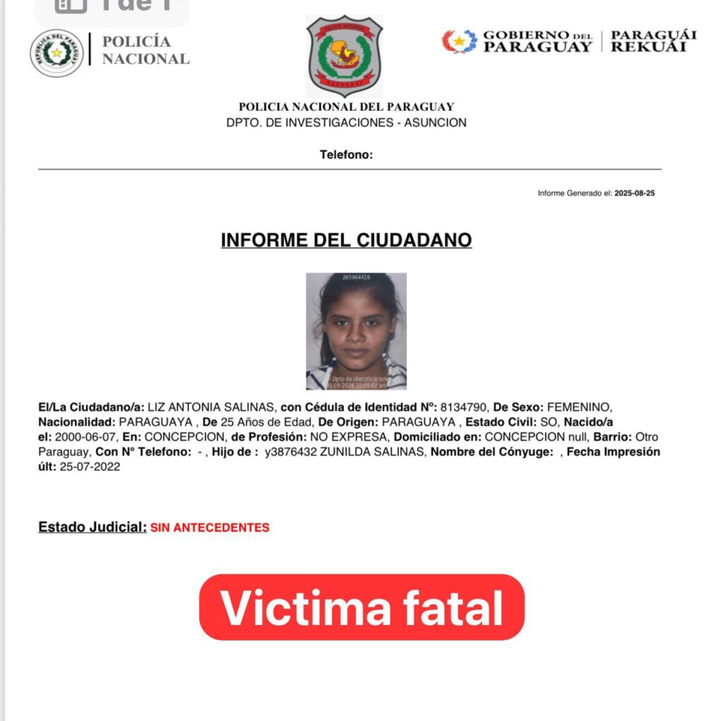 Un trágico caso de feminicidio conmocionó este lunes al barrio San Antonio de Concepción. La víctima fue identificada como Liz Antonia Salinas, de 25 años, quien perdió la vida tras ser atacada con un cuchillo por su pareja, Diego Borja Ramírez, de 35 años. El agresor le ocasionó graves heridas en el cuello, prácticamente degollándola, para luego huir de la vivienda.