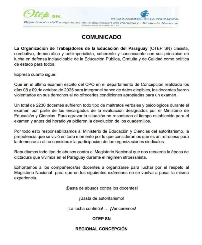Según el comunicado emitido por la OTEP (Organización de Trabajadores de la Educación del Paraguay) , los educadores fueron sometidos a condiciones que califican como “inhumanas e injustas”. Afirma que no se les permitió usar lápiz y papel, beber agua durante la prueba ni levantarse para ir al baño, incluso en el caso de una docente embarazada.