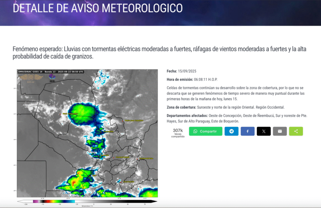 La Dirección de Meteorología e Hidrología emitió un aviso meteorológico en el que alerta sobre la posibilidad de lluvias con tormentas eléctricas moderadas a fuertes, ráfagas de vientos y la caída de granizos en varias zonas del país.
