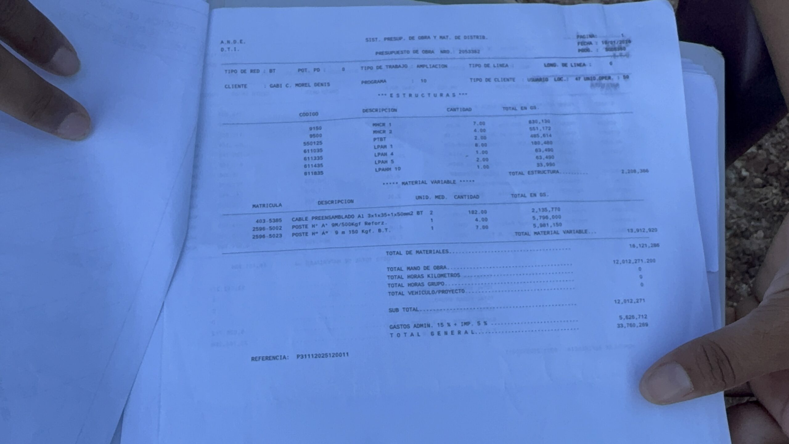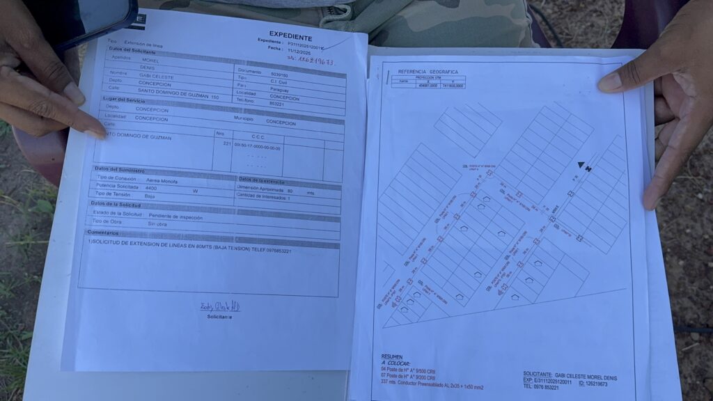 Se trata de Gabi Morel, quien relató que al instalarse en el lugar inició las gestiones correspondientes ante la Administración Nacional de Electricidad (ANDE) para acceder al servicio de manera formal. Según explicó, la institución le presentó un proyecto para extender unos 100 metros de red, cuyo costo supera los 33 millones de guaraníes, suma que asegura no poder cubrir de forma individual.