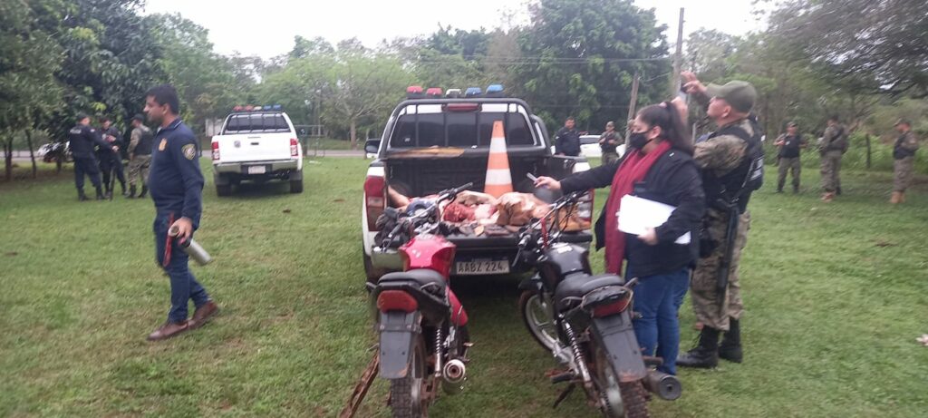 La policía Nacional realizó, en la mañana de este sábado, tres allanamientos en una zona rural de Horqueta, donde incautó arma de fuego, prendas de vestir, carne vacuna presumiblemente clandestina y aprehendió a dos personas de sexo masculino.