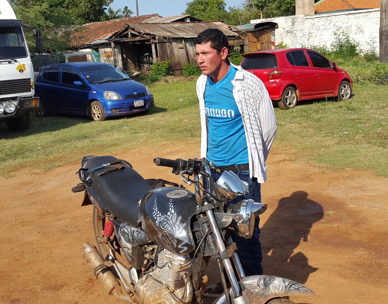 El demorado es identificado como Roberto Giménez, Pyo. 26 años de edad, domiciliado en el barrio Santo domingo de esta ciudad. El mismo manejaba una motocicleta tipo cobrador, repintada, y portaba un arma blanca (puñal). Le acompañaba Milciades Gutiérrez, Pyo. Mayor de edad, quien logró escaparse de los uniformados.