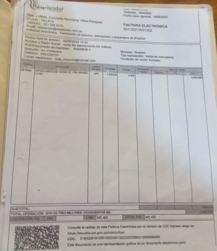 Supuesta compra realizada por Dolly Esquivel cambiando el porcentaje de hipoclorito de sodio