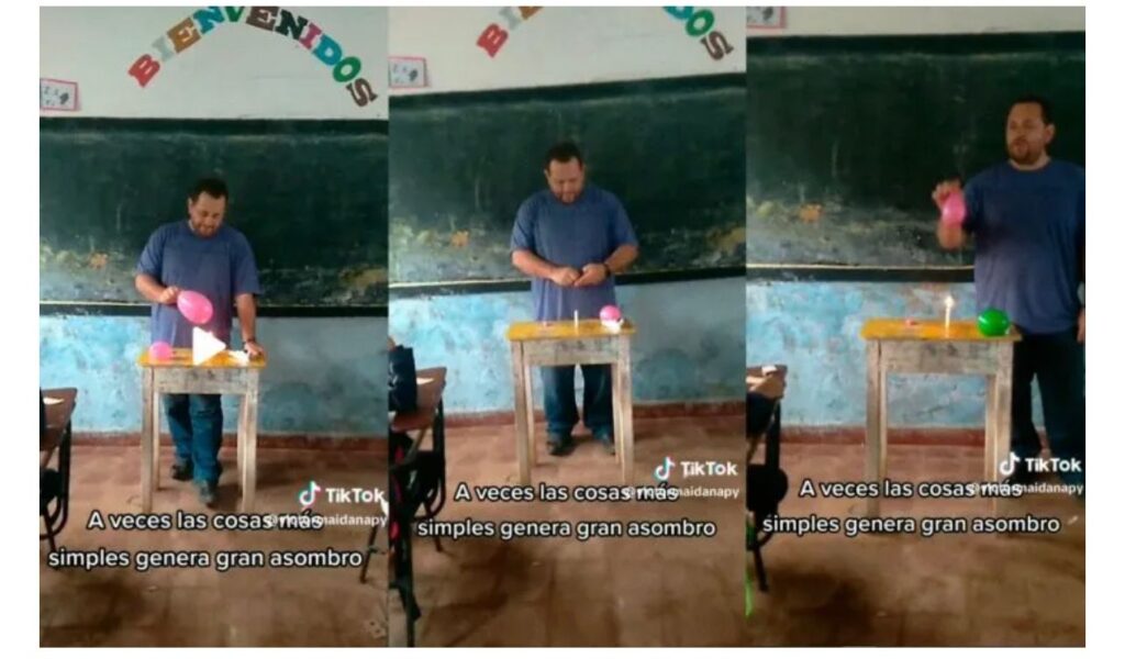 El video de un docente de la escuela Santa Teresa de Calcuta, de Concepción, identificado como Víctor Maidana, empezó a recorrer las redes sociales por su ingenio para mostrar un experimento con globos. El ensayo muestra cómo un globo inflado con aire explota en contacto con fuego y otro llenado con agua no.