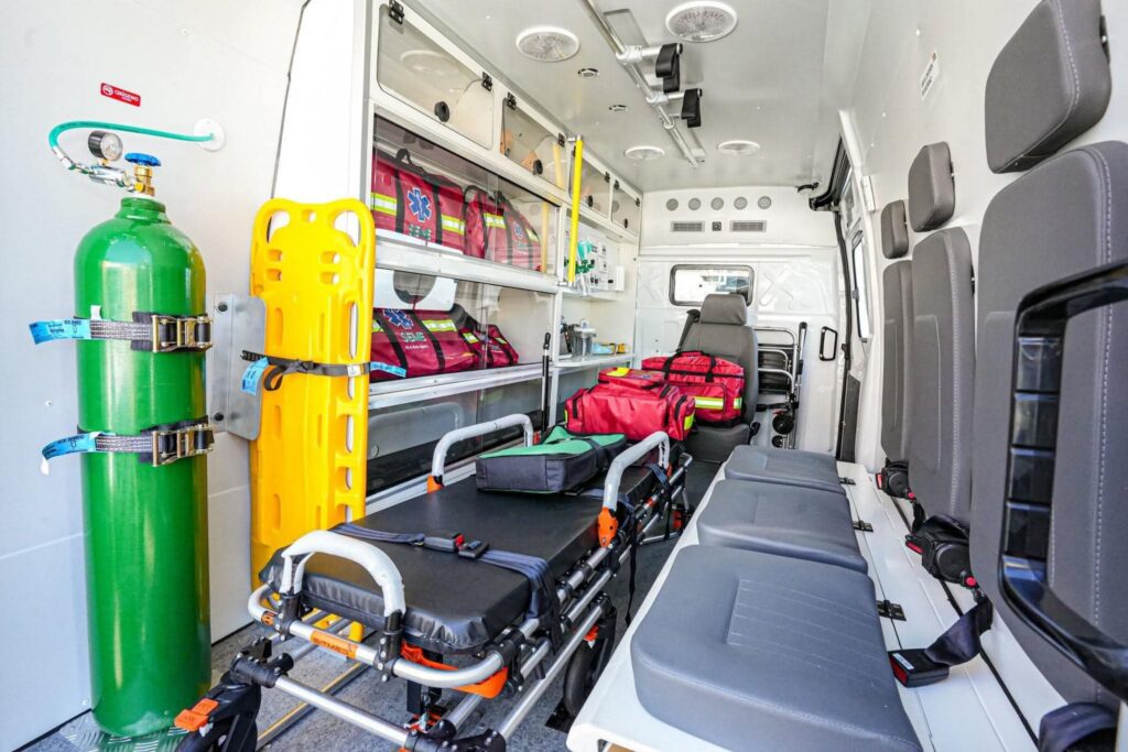 La ambulancia entregada está equipada con tecnología biomédica de cuidados intensivos, incluyendo un completo kit de manejo de vías aéreas, balón de oxígeno portátil y otros insumos esenciales para brindar atención oportuna y segura a pacientes en estado crítico.