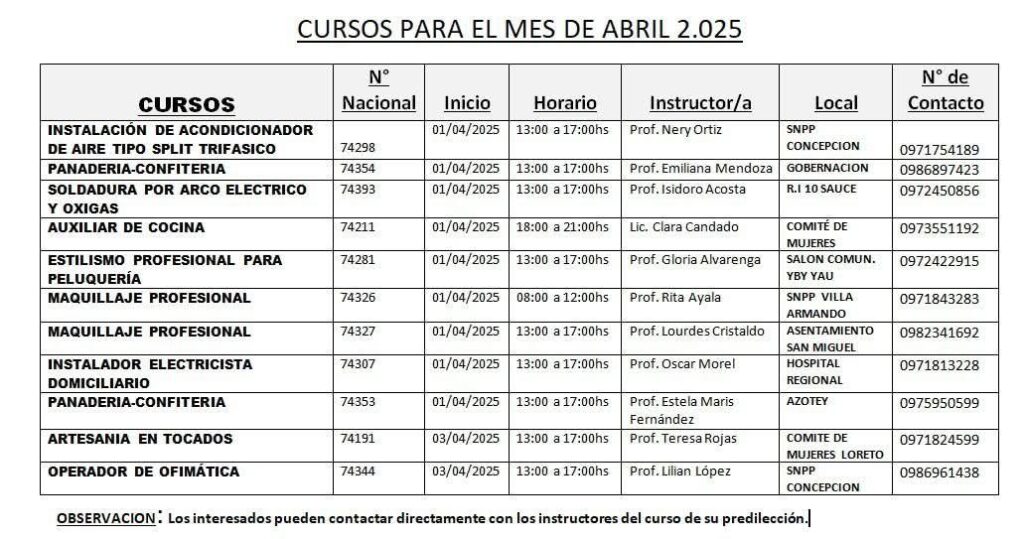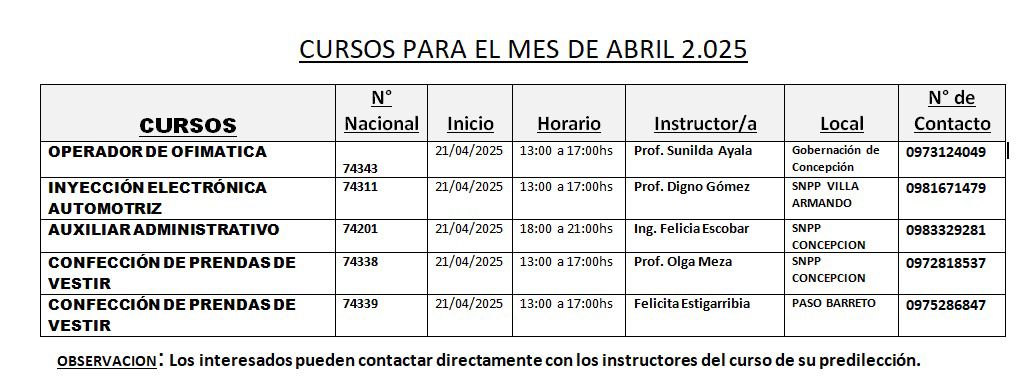 El Servicio Nacional de Promoción Profesional (SNPP), sede regional Concepción, anunció la habilitación de más de 16 nuevos cursos de formación profesional que serán impartidos en varios distritos del departamento. Las capacitaciones están dirigidas a jóvenes y adultos interesados en adquirir habilidades técnicas o administrativas que les permitan mejorar sus oportunidades laborales.