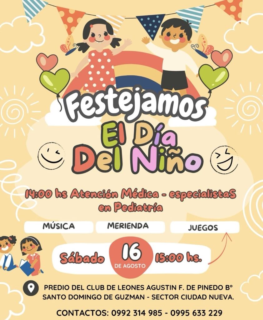 La Sociedad Paraguaya de Pediatría, filial Concepción, en coordinación con el Club de Leones Agustín F. de Pinedo y otras instituciones locales, se encuentra organizando un evento especial para homenajear a los más pequeños en el marco del Día del Niño. La celebración tendrá lugar el sábado 16 de agosto, a partir de las 14:00 horas, en el predio del Club de Leones, ubicado en el barrio Santo Domingo de Guzmán, sector Ciudad Nueva.