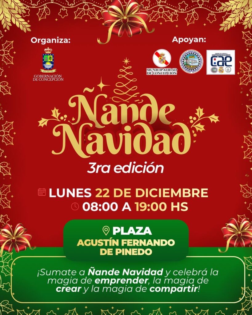 La feria “Ñande Navidad” se realizará este lunes 22 de diciembre, de 08:00 a 19:00 horas, en la Plaza Agustín Fernando de Pinedo, con el acompañamiento de la Gobernación de Concepción, la Municipalidad y otras instituciones que apoyan esta iniciativa.