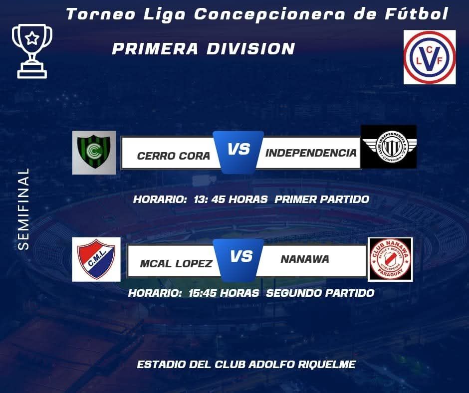 La emoción del fútbol local se vivirá a pleno este domingo 13 de julio en el estadio “Damián Castro” del Club Adolfo Riquelme, con la disputa de las semifinales de ida de la Liga Concepcionera de Fútbol, categoría Primera División.