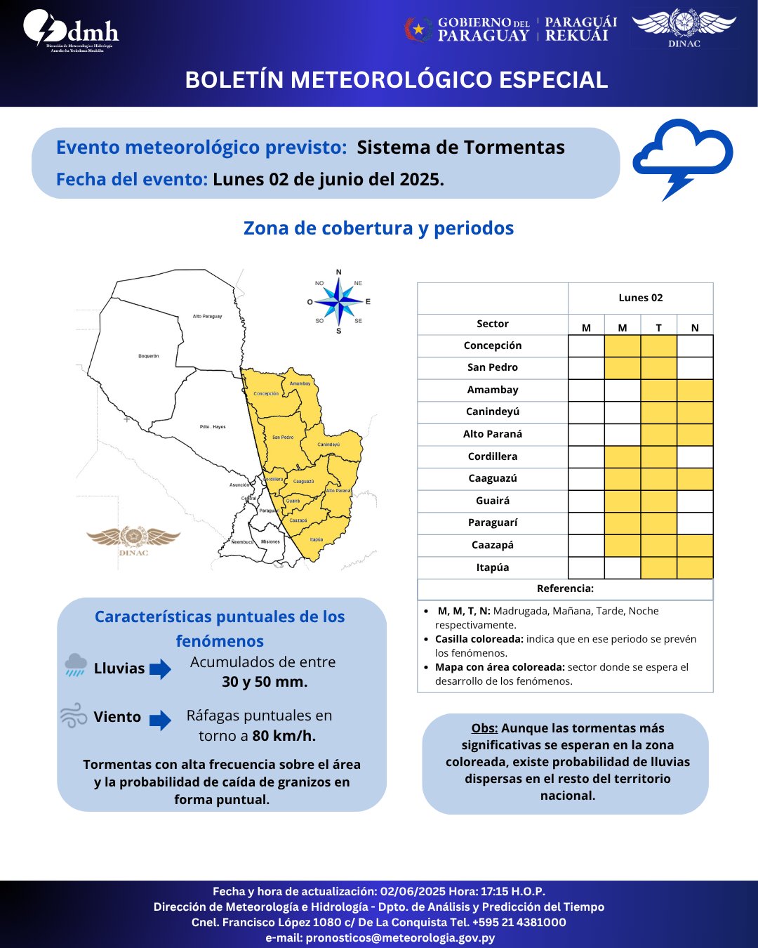 La Dirección de Meteorología e Hidrología de Paraguay emitió una alerta este lunes 2 de junio advirtiendo sobre un sistema de tormentas que afectará a 12 departamentos en distintas franjas horarias. El fenómeno incluye lluvias fuertes, actividad eléctrica frecuente, ráfagas de viento que podrían superar los 80 km/h y probabilidad de granizos puntuales.