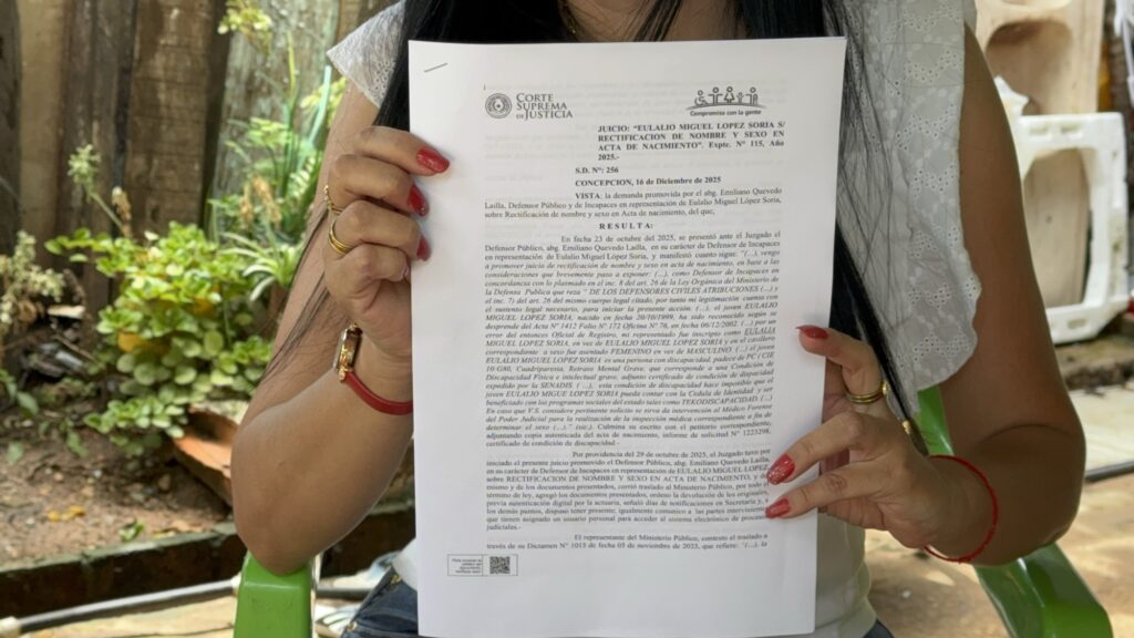 Una sentencia judicial permitió rectificar el nombre y sexo en el acta de nacimiento de Eulalio Miguel López Soria, tras un trabajo conjunto entre la Universidad Católica, el Registro Civil y la Defensoría Pública.