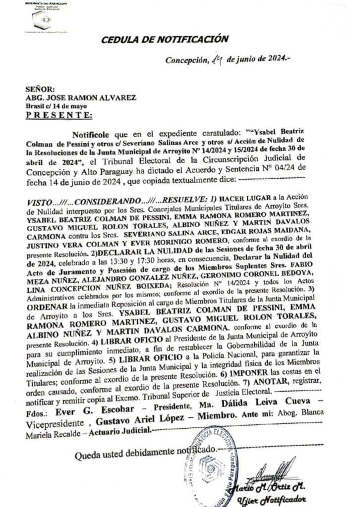 El Tribunal Electoral de Concepción y Alto Paraguay emitió este viernes un Acuerdo y Sentencia que anula todas las actuaciones de la Junta Municipal de Arroyito desde el 30 de abril de 2.024 en adelante. Además, ordena la restitución inmediata de los cinco concejales titulares que fueron destituidos.