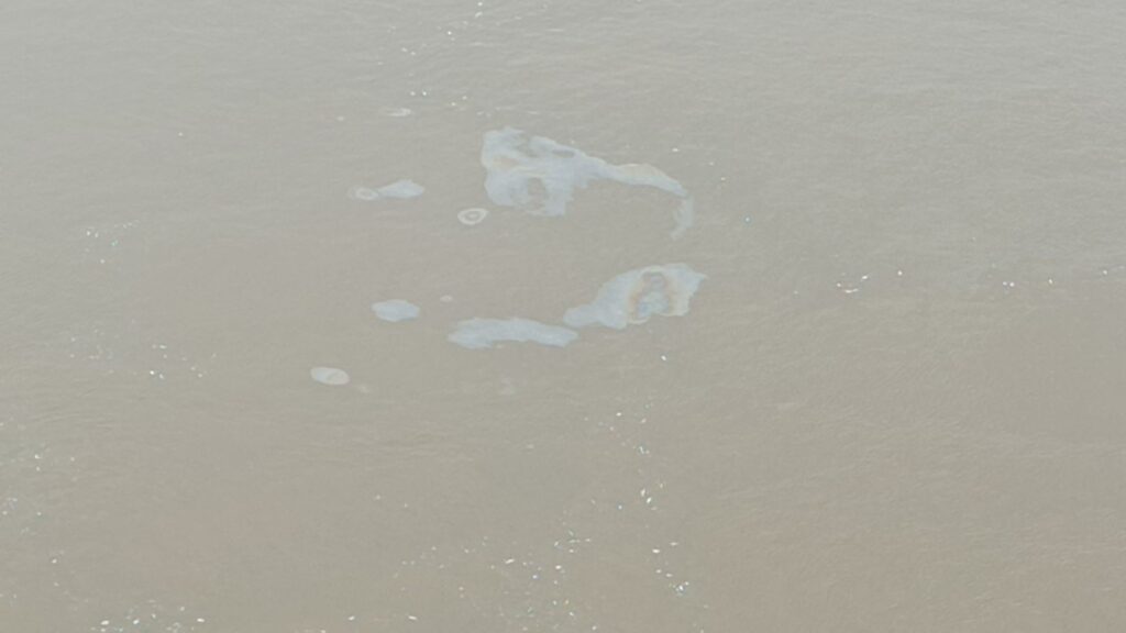 En la superficie del río se observan manchas iridiscentes que podrían corresponder a aceite o combustible.