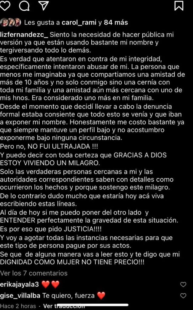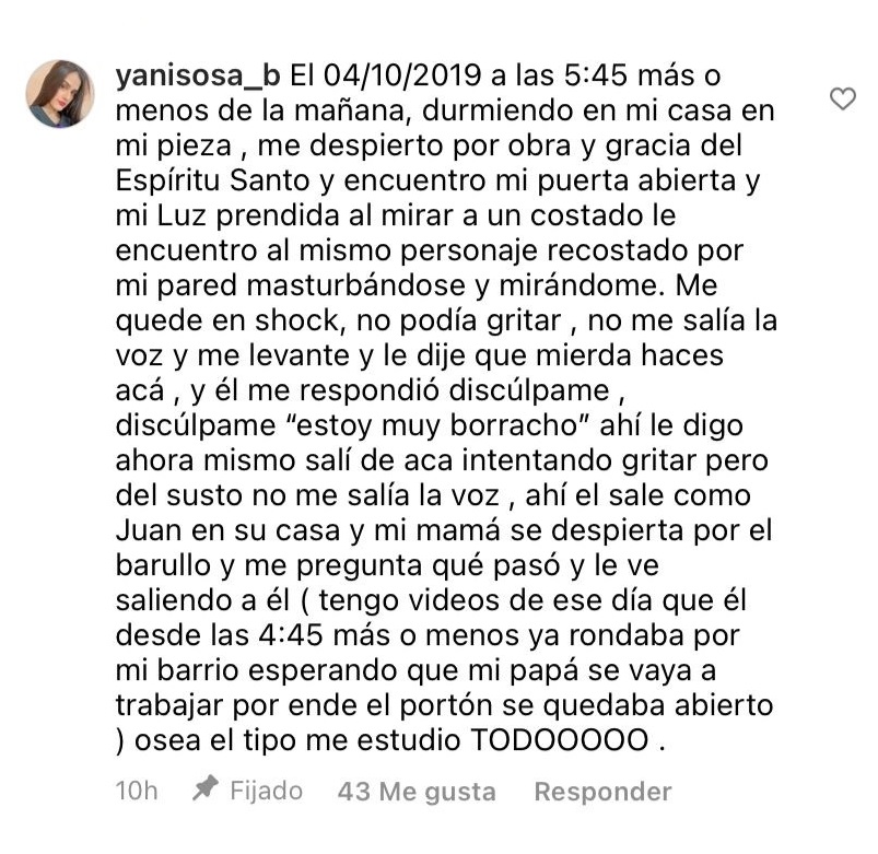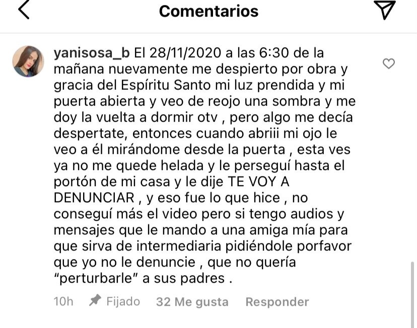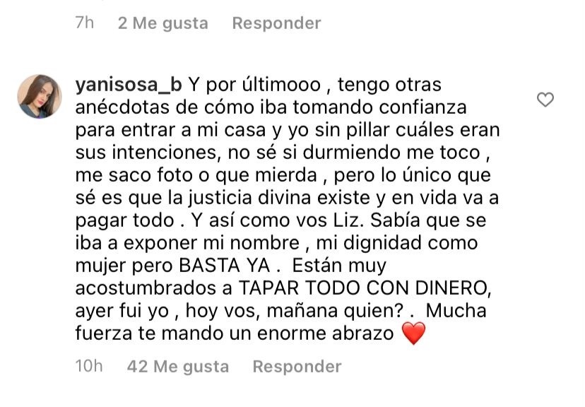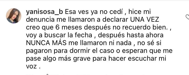 Tras darse a conocer el caso en Instagram, en el comentario del post, otra joven identificada como Yani Sosa también afirmó que fue victima del sindicado en dos oportunidades y que realizó la denuncia ante la fiscalía pero el caso no corrió.