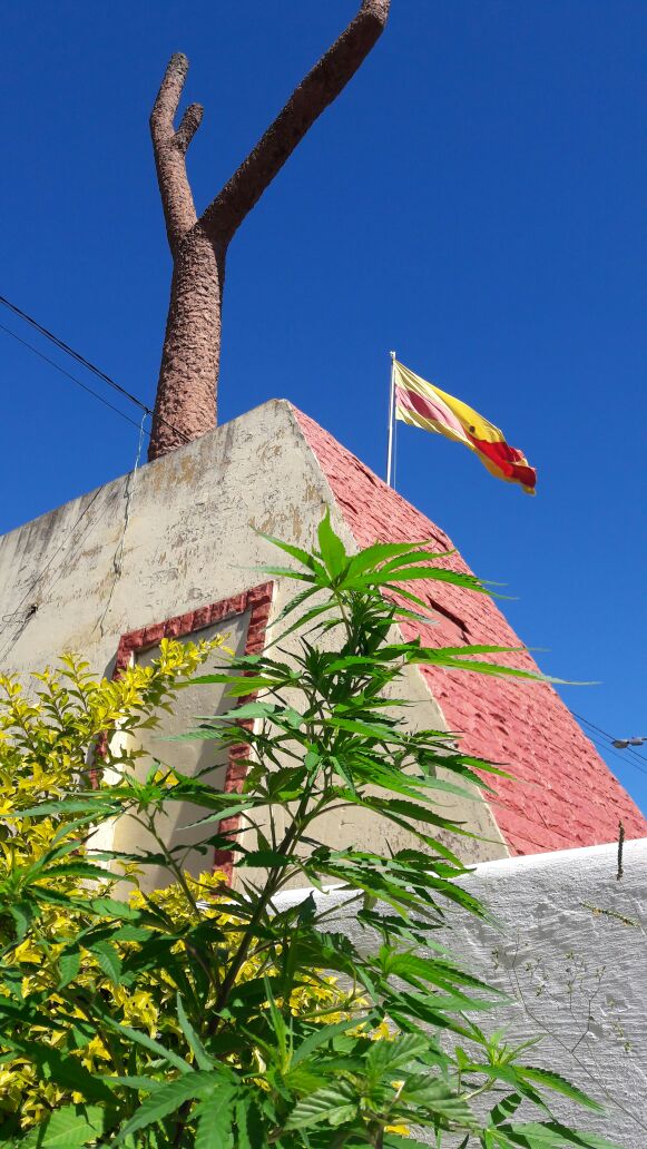Una planta de la hierba prohibida de unos 100 cm. crece en el pequeño jardín que ornamenta la entrada principal a la ciudad de Horqueta.
