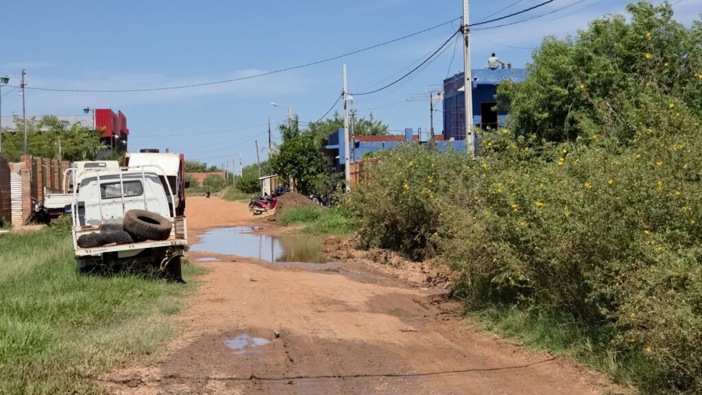 Otro punto crítico es el pésimo estado de las calles. Los vecinos afirman que, cuando llueve, quedan prácticamente aislados debido a la acumulación de agua y a cunetas obstruidas, lo que impide el normal tránsito. Denuncian además que el paso constante de maquinarias pesadas habría deteriorado aún más las vías que anteriormente habían sido arregladas con el esfuerzo conjunto de los propios vecinos.